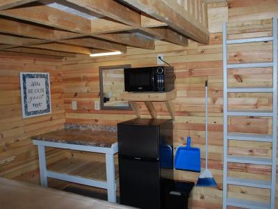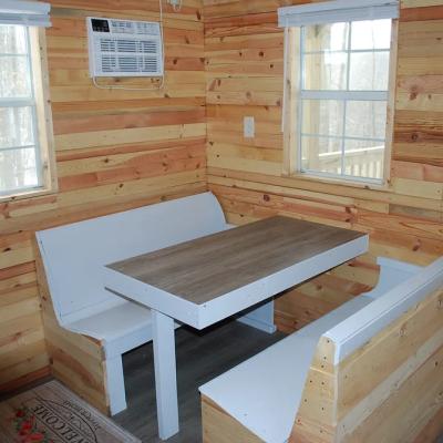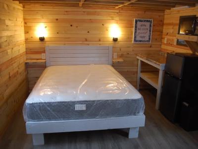The cabin has a queen size bed and two twin beds in the loft (please note that the loft is suitable for smaller people).
