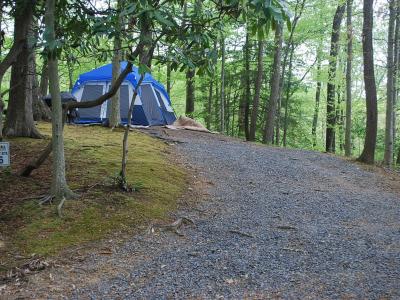 Site 42 - can hold a large tent or 2 to 3 two man tents. Private site. Good for car/van and roof-top camping. No motorcycles. A 5 minute walk to the bathhouse.